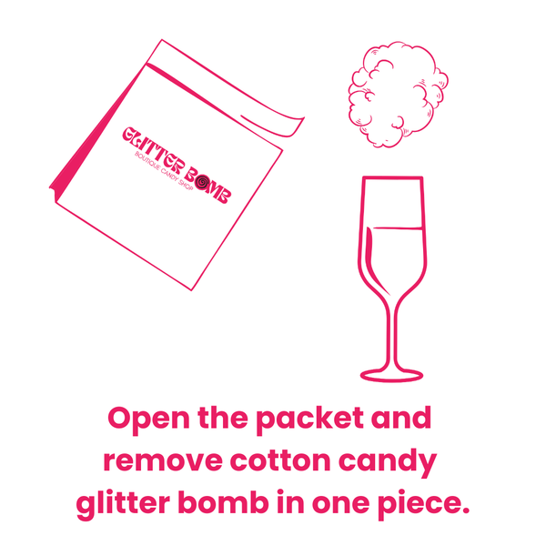 Our Drink Glitter Bombs are hand-spun puffs of cotton candy filled with edible glitter inside that leaves your drink with a stunning sparkle and a touch sweetness!
